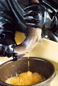 Les œufs d'une bonne dizaine de femelles sont arrosés avec la laitance (sperme) de trois ou quatre mâles puis mélangés doucement ; deux à trois minutes après, on ajoute un peu d'eau.