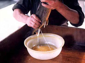 La récolte est faite à sec dans une passoire, puis les œufs sont mis